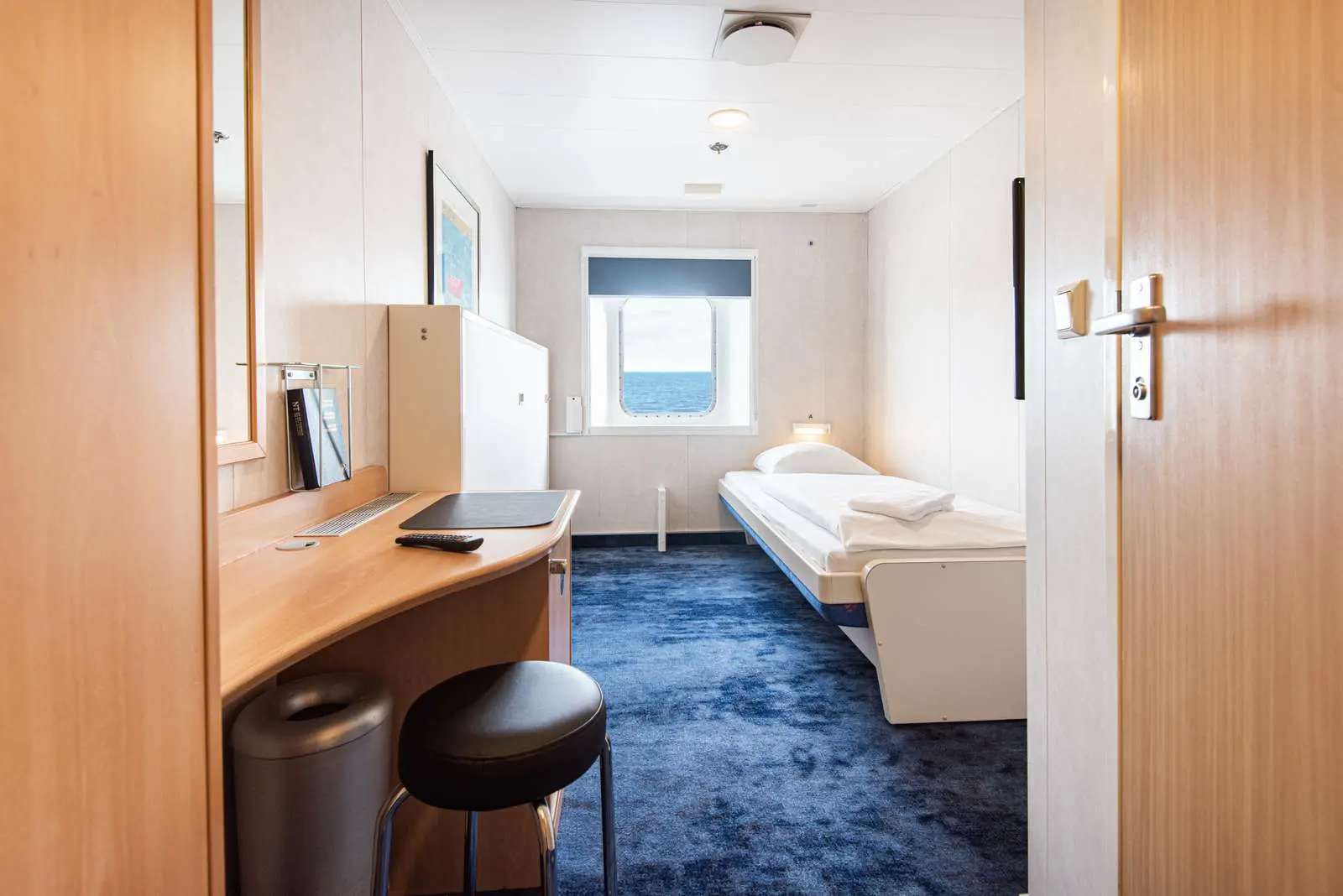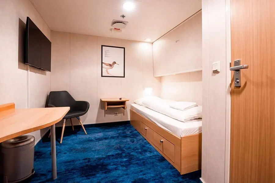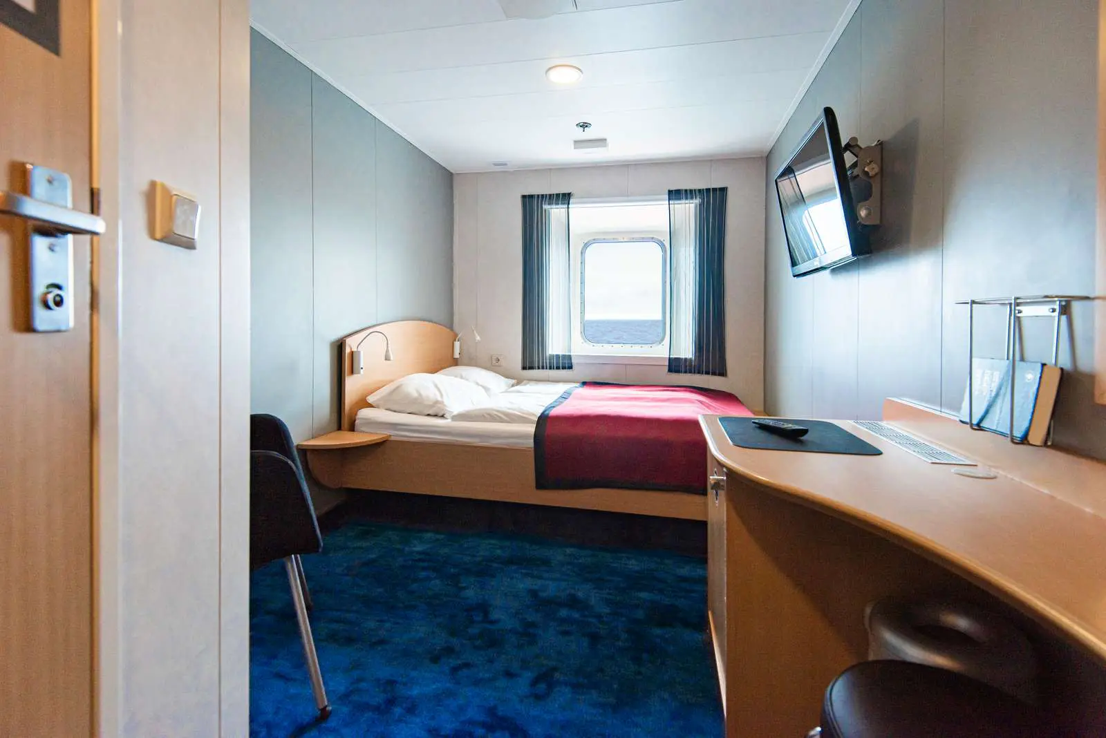 Die Kabinen haben zwei untere Betten (90x200 cm), Dusche/WC und Schrank. Es gibt eine Steckdose, eine Steckdose für Rasierer, Haarföhn und Fernseher.