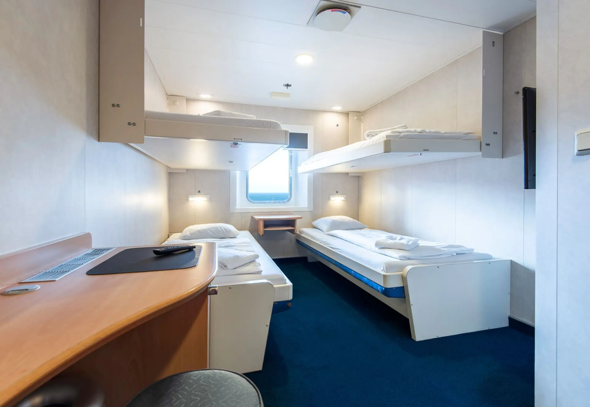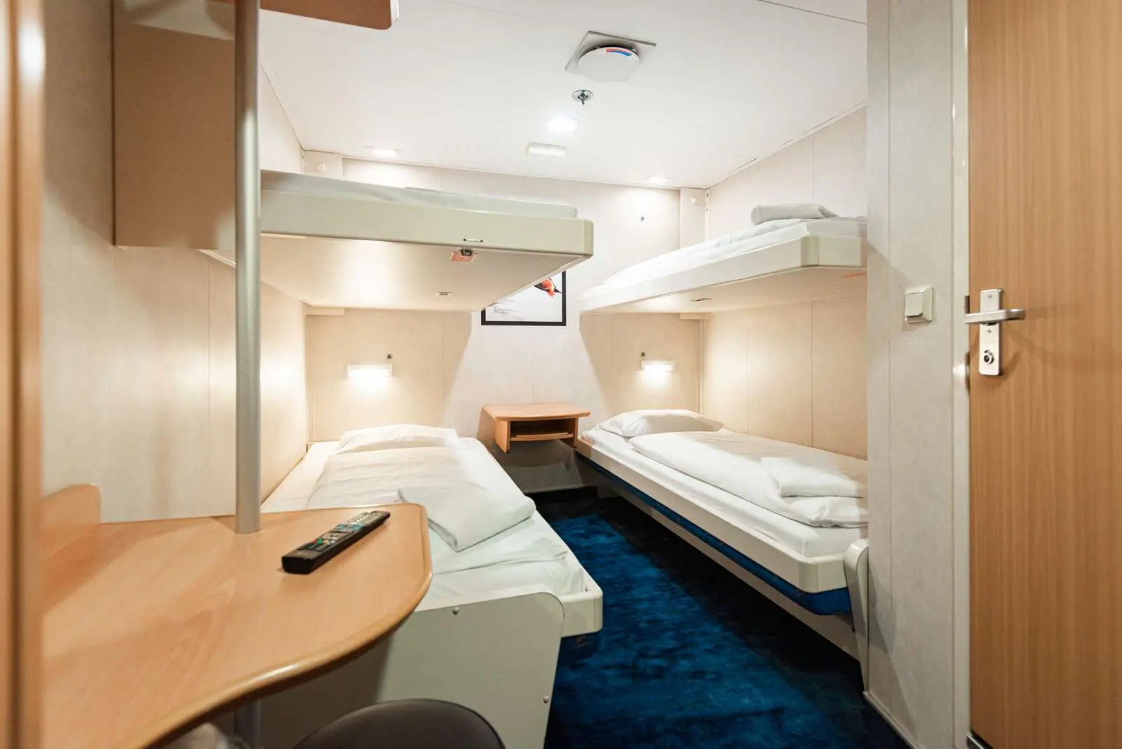 Die Kabinen verfügen über zwei untere Betten (200x90 cm) und zwei obere Betten (195x85 cm), Schrank, Haarföhn, Fernseher, sowie Steckdosen in Kabine und Bad.