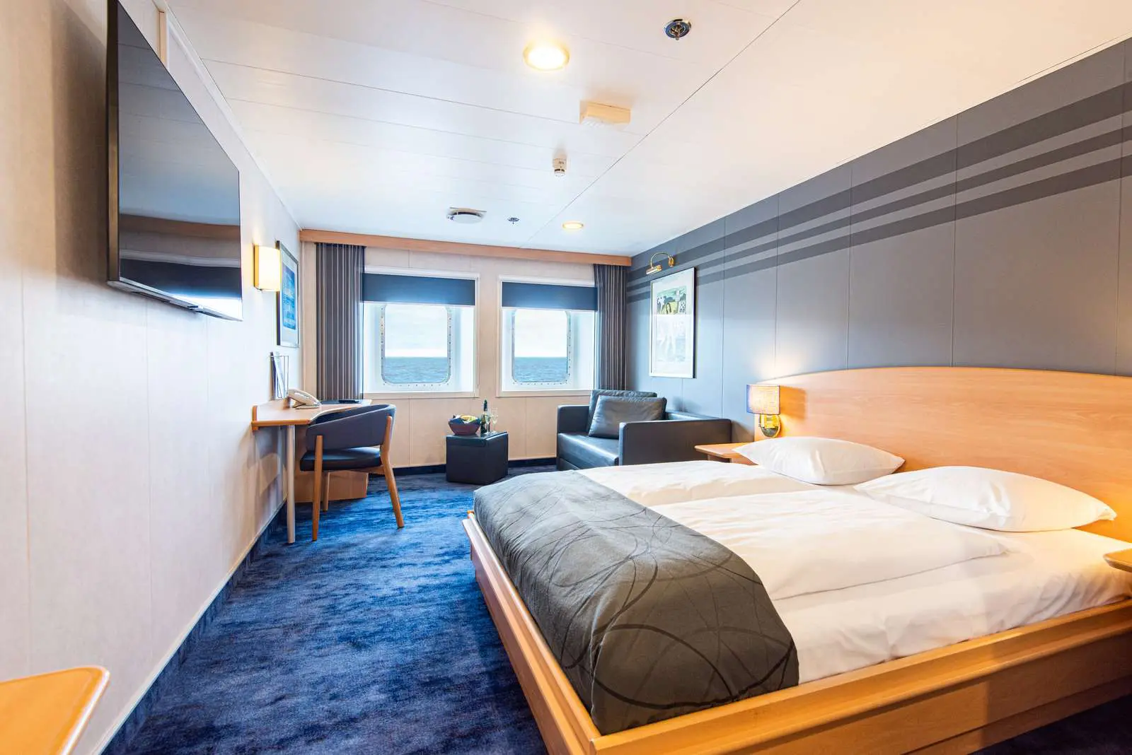 Die geräumige Außenkabine verfügt über ein Doppelbett (160x200 cm) und ein Schlafsofa (130x210 cm), Dusche/WC, eine Minibar und eine Kaffeemaschine.