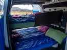 Das Campmobil ist mit einem unteren Doppelbett (175 x 140cm) und einem oberen Doppelbett (185 x 125cm) ausgestattet. Es gibt eine einfache Küchenzeile mit einer Spüle mit Kaltwasser und einer elektrischen Kühlbox.